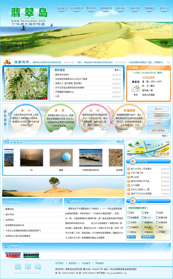 翡翠島位于中國(guó)最美的八大海岸之一 —— 河北省昌黎縣黃金海岸的南部,專家評(píng)語(yǔ)為:“沙漠與大海的吻痕”。其東、北、西、三面由渤海和七里海環(huán)繞,是一座由金黃色細(xì)沙和綠色植被相間構(gòu)成的半島。
