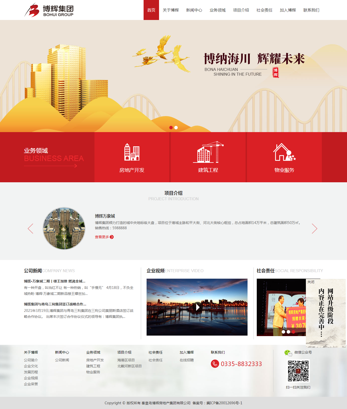博輝集團(tuán)創(chuàng)立于2003年,總部位于美麗的濱海城市秦皇島,是一家以房地產(chǎn)開發(fā)為主,集建筑工程、物業(yè)管理等為一體的多元化發(fā)展的集團(tuán)公司。集團(tuán)一直致力于城市發(fā)展建設(shè),積極響應(yīng)國家號(hào)召參與新農(nóng)村建設(shè),為改善本地區(qū)百姓的居住環(huán)境、提升旅游文化發(fā)展、帶動(dòng)本地區(qū)經(jīng)濟(jì)繁榮和城市發(fā)展貢獻(xiàn)力量。